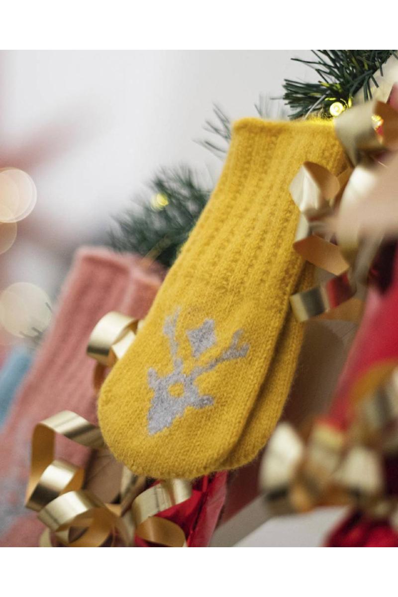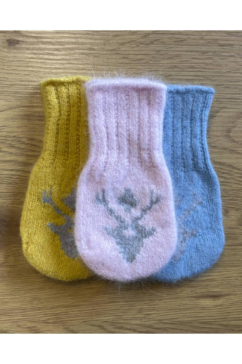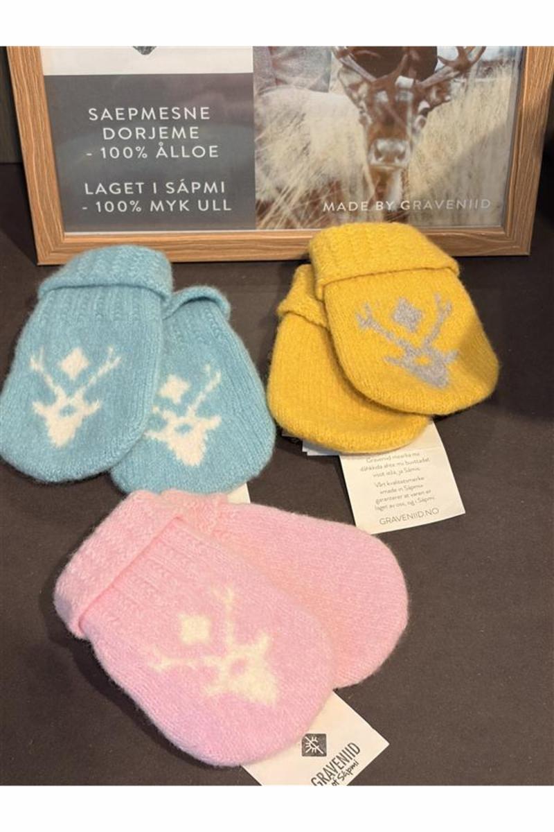 Myke og tovede babyvotter uten tommel i 100% ull. Motiv av reinkalv.