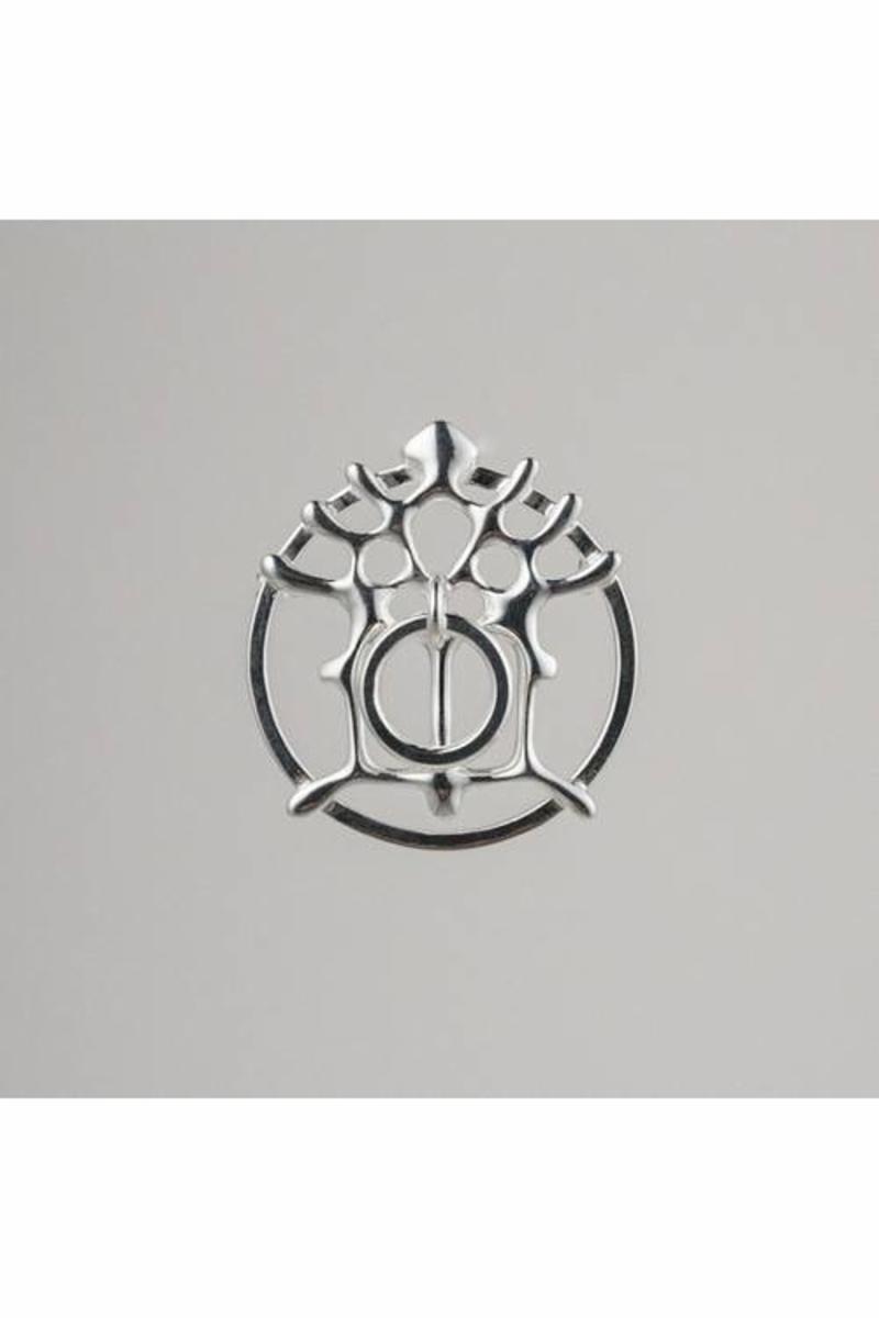 Den "Hellige" bokstaven M med krone på for Jomfru Maria ble brukt siden middelaldrene og Katolsk tid. Etter reformasjonen ble symbolikken glemt slik at fantasifulle forvandlinger slik som denne kunne utvikle seg. Gjerne ble bokstavene M eller A("Ave Maria") satt i en ring,slik at de kunne tjene som malje. Ringen som henger på har ingen betydning. Sølv 925.